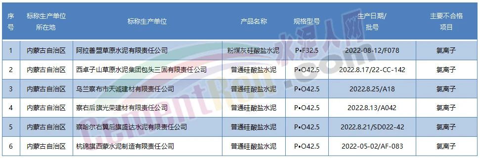 內(nèi)蒙自治區(qū)5批次水泥氯離子不合格