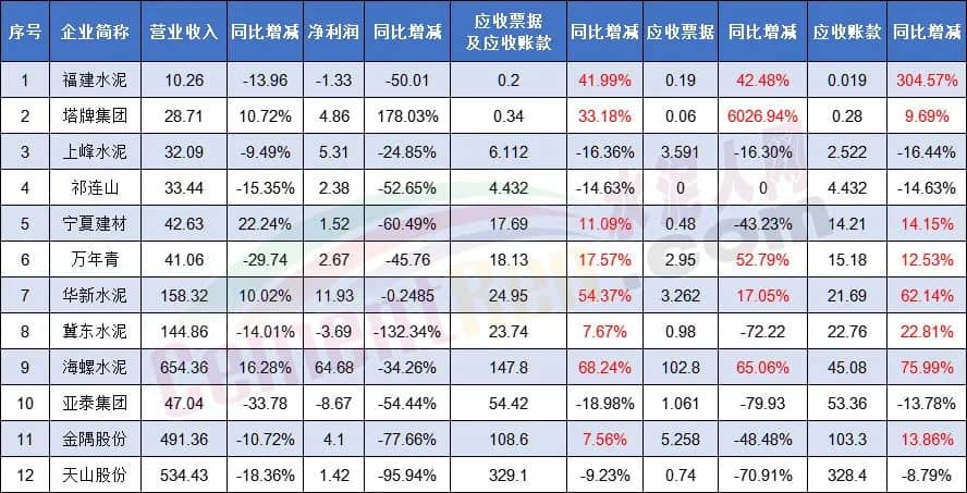 近日,多家水泥上市公司發布2023年半年報,截至25日晚間,公布中報的12家水泥企業中僅塔牌集團一家業績同比上升。海螺水泥、華新水泥、塔牌集團、福建水泥、萬年青、寧夏建材、冀東水泥、金隅股份等8家企業應收賬款同比均有不同幅度的增加。