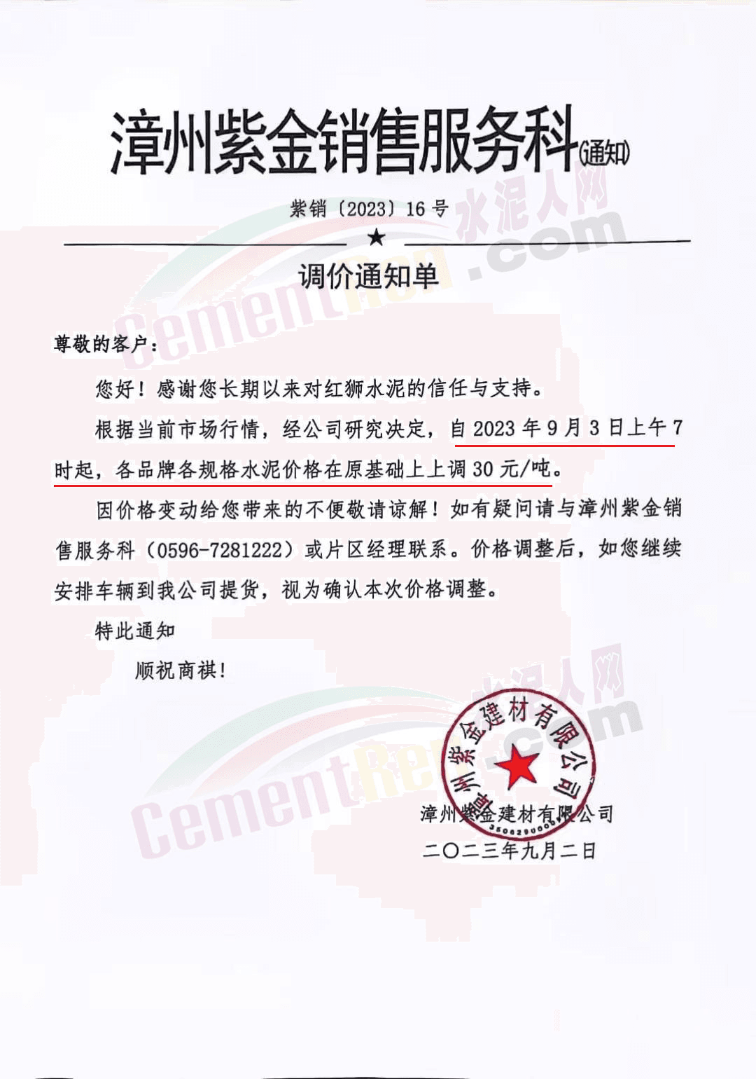 紅獅水泥旗下漳州紫金水泥、龍海紅獅、大田紅獅銷售服務科通知,根據當前市場行情,經公司研究決定,自2023年9月3日上午7時起,各品牌各規格品種水泥價格在原基礎上上調30元/噸。