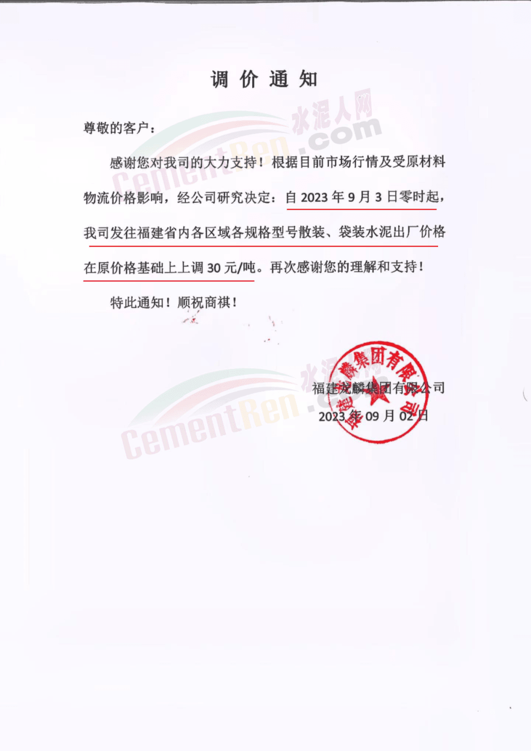 福建龍麟集團有限公司通知,根據目前市場行情及受原材料物流價格影響,經公司研究決定:自2023年9月3日0時起,公司發往福建省內各區域各規格型號散裝、袋裝水泥出廠價格在原價格基礎上上調30元/噸。