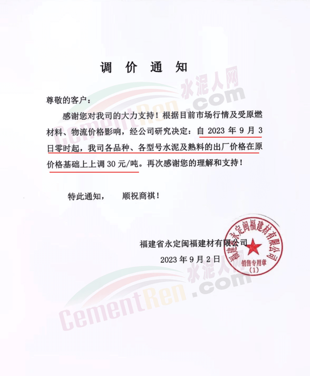 福建省永定閩福建材有限公司通知,根據目前市場行情及受原燃材料、物流價格影響,經公司研究決定:自2023年9月3日0時起,公司各品種、各型號水泥及熟料的出廠價格在原價格基礎上上調30元/噸。