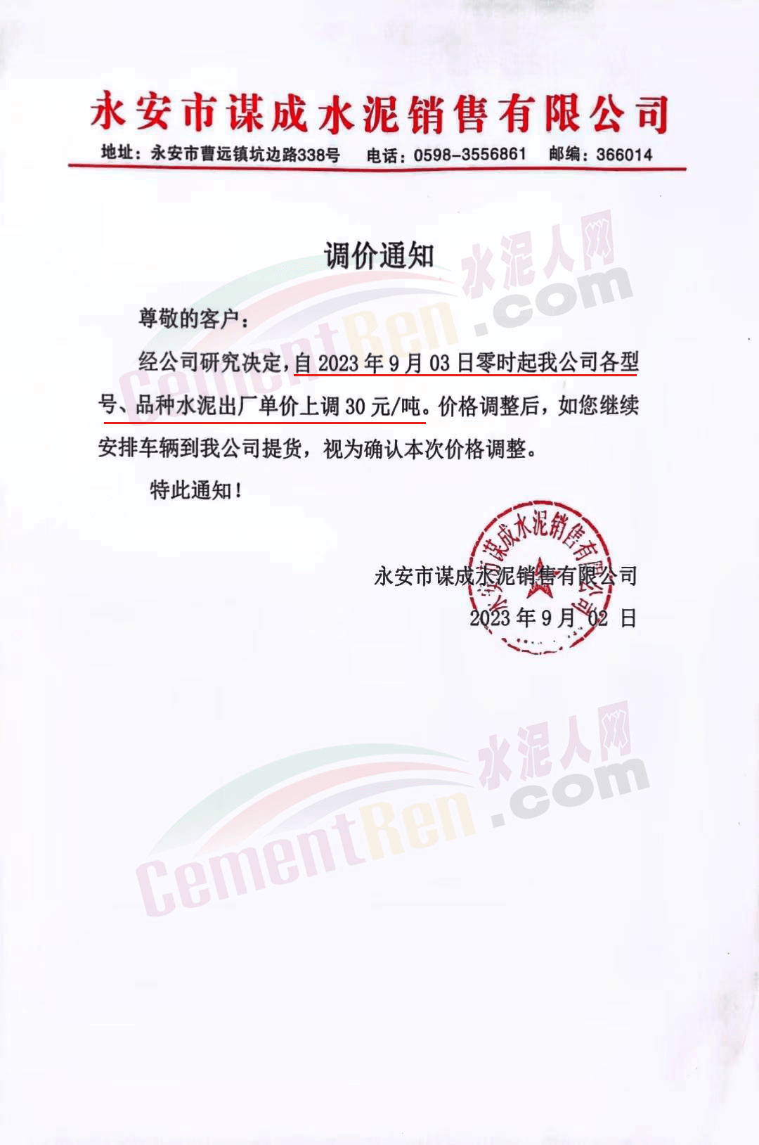 永安市謀成水泥銷售有限公司通知,經公司研究決定自2023年9月3日零時起公司水泥出廠單價上調30元/噸。