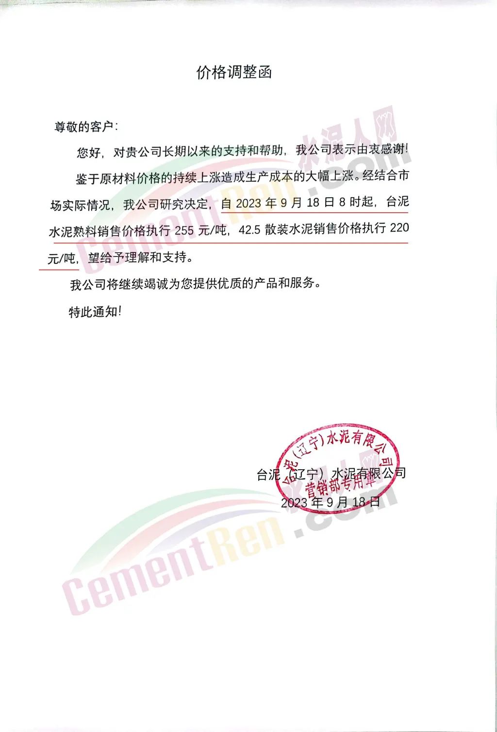 臺泥(遼寧)水泥有限公司通知,鑒于原材料價格的持續上漲造成生產成本的大幅上漲。經結合市場實際情況,公司研究決定,自2023年9月18日8時起,臺泥水泥熟料銷售價格執行255元/噸,42.5散裝水泥銷售價格執行220元/噸。