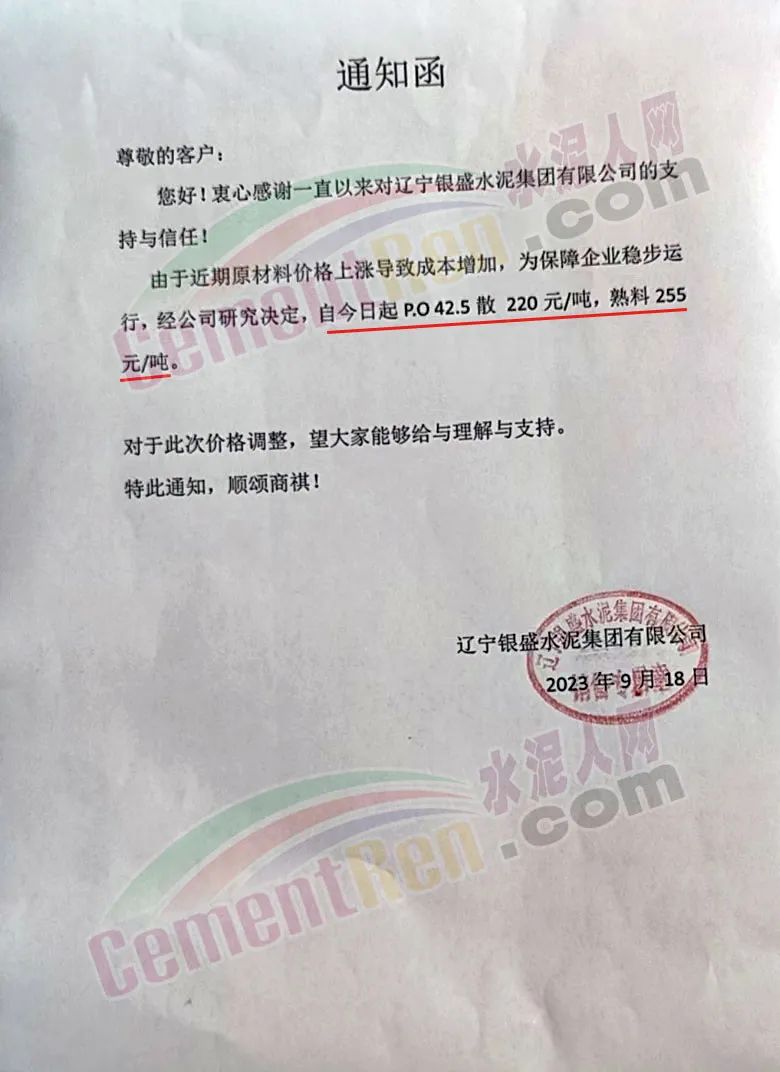 遼陽天瑞水泥有限公司通知,由于近期生產成本增加等因素,根據目前市場情況,經公司研究決定:自2023年9月18日8:00起執行新報價。其中P.O42.5散裝水泥出廠含稅報價220元/噸。熟料報價255元/噸。