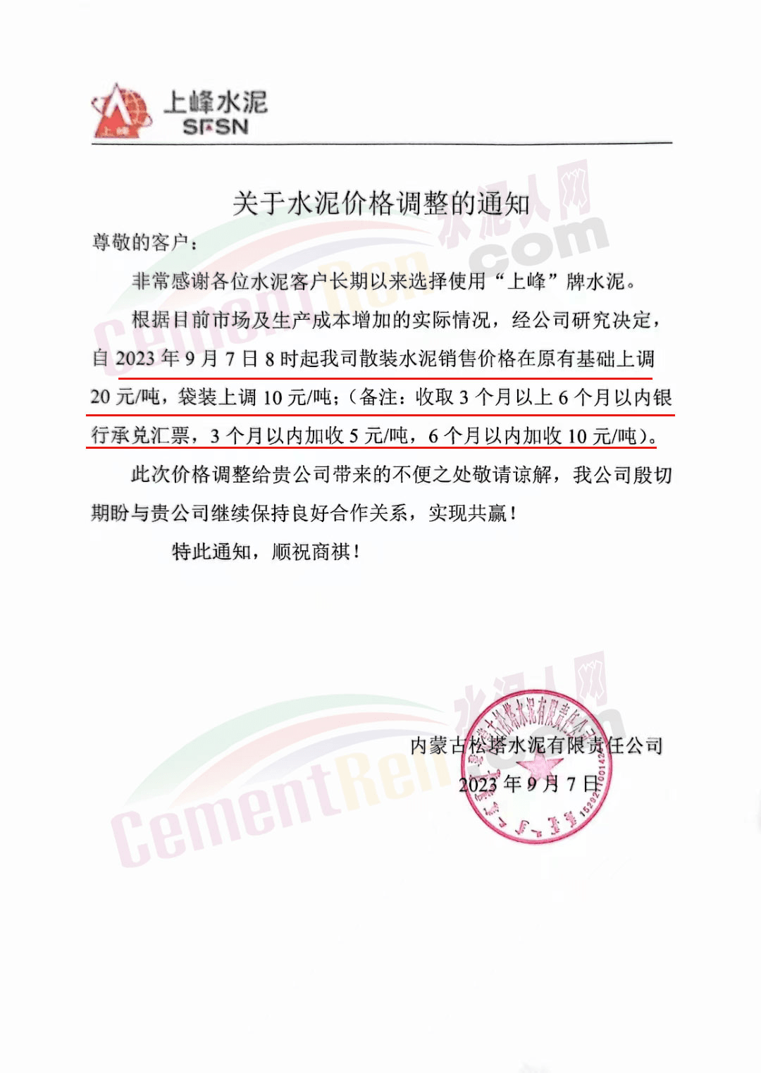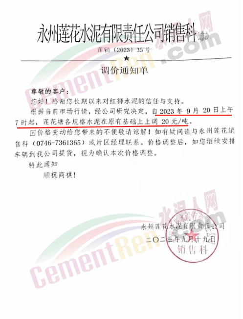 華新水泥(宜昌)公司、葛洲壩松滋水泥通知,因公司生產(chǎn)成本持續(xù)上漲,市場(chǎng)行情發(fā)生變化,經(jīng)公司研究決定于2023年9月20日17:00起,所有品種水泥價(jià)格上調(diào)20元/噸。