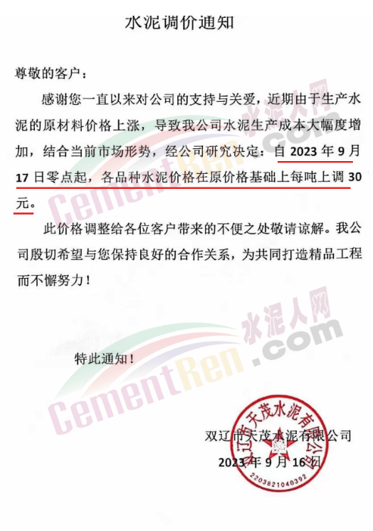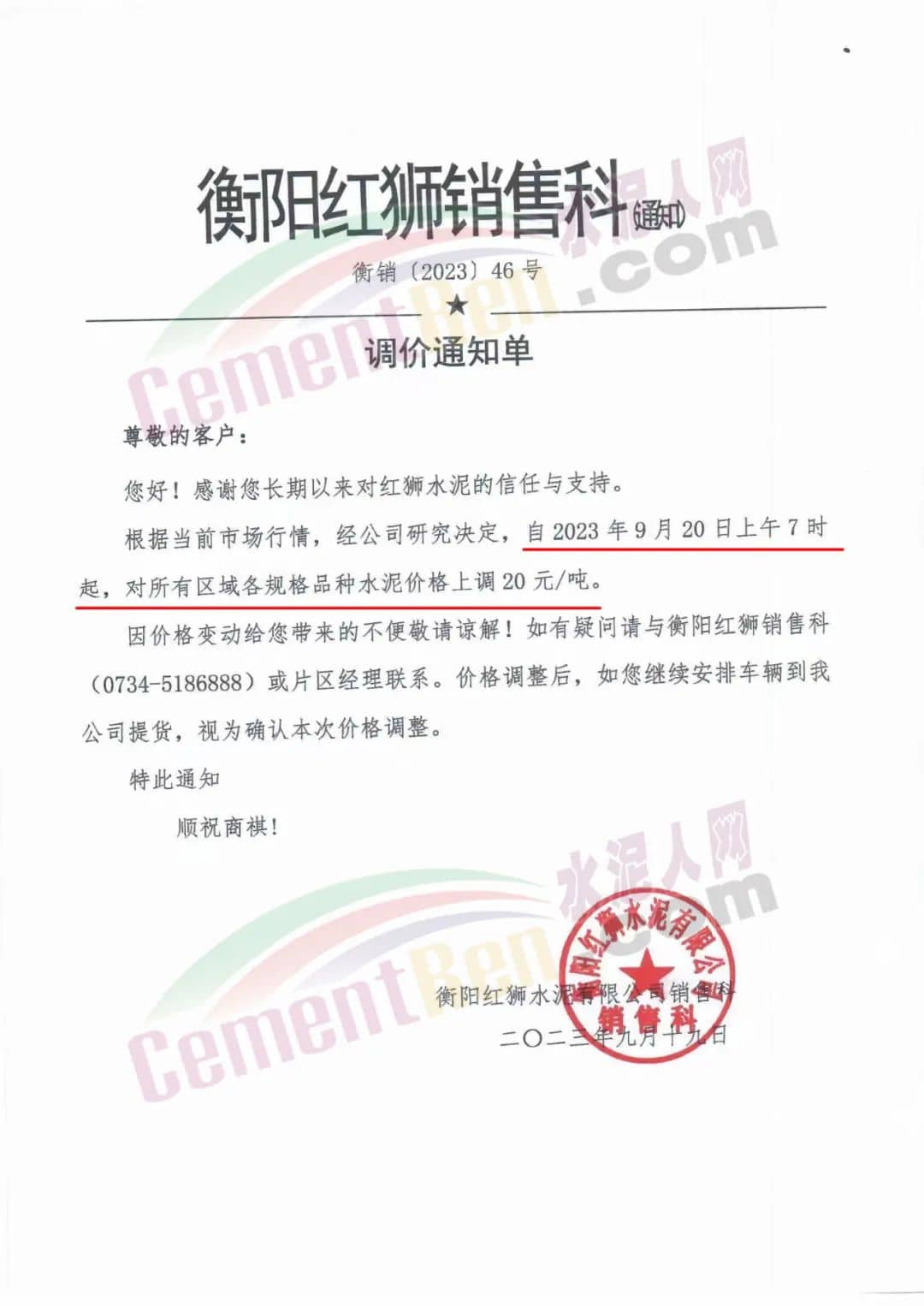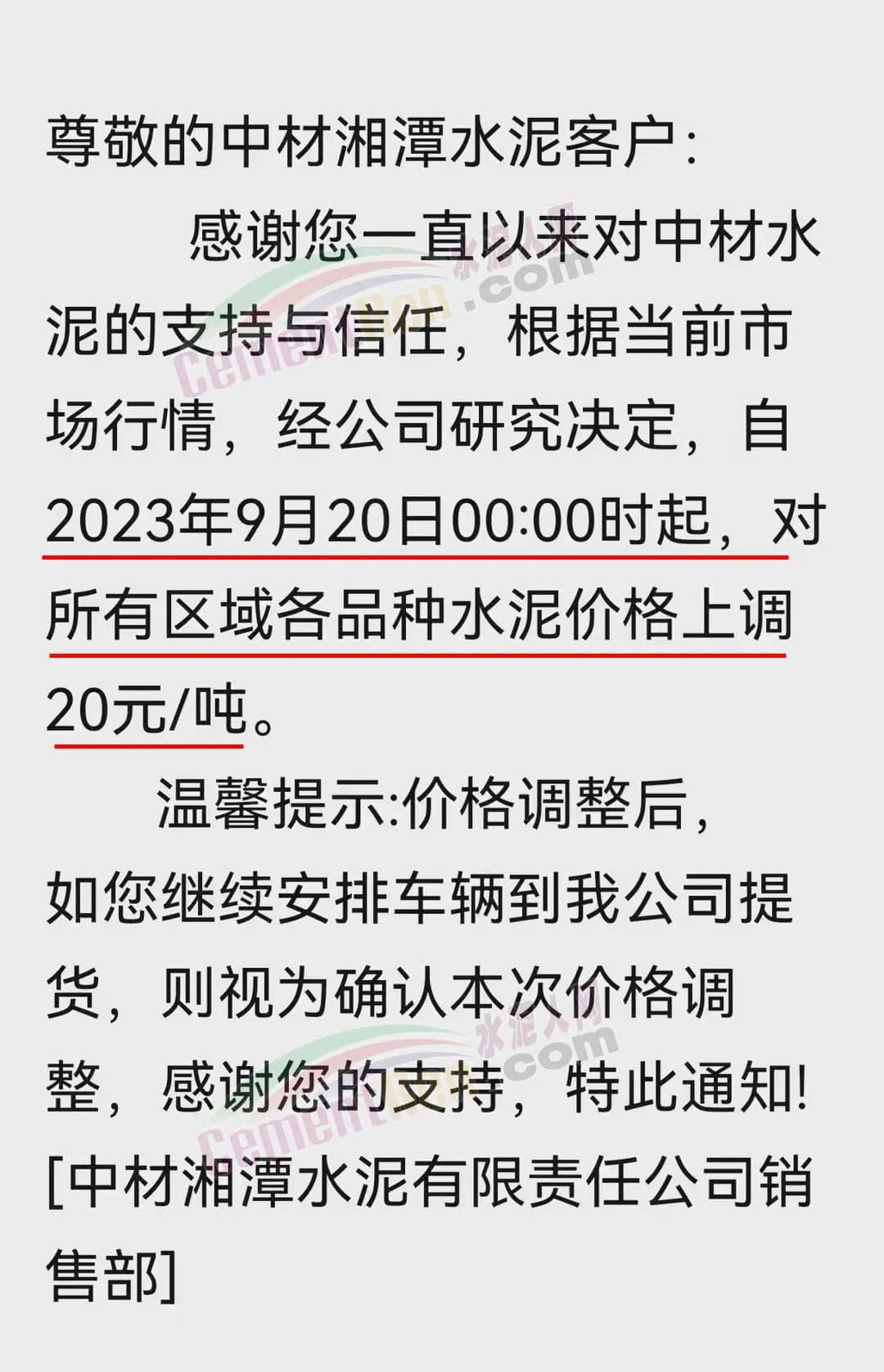中南水泥旗下耒陽(yáng)南方、寧鄉(xiāng)南方、瀏陽(yáng)南方、桃江南方、坪塘南方、韶峰南方、中材湘潭水泥等多家企業(yè)通知,根據(jù)當(dāng)前市場(chǎng)行情,經(jīng)公司研究決定,從2023年9月20日0時(shí)起,對(duì)各區(qū)域、各品種的水泥出廠價(jià)在原基礎(chǔ)上上調(diào)20~40元/噸。