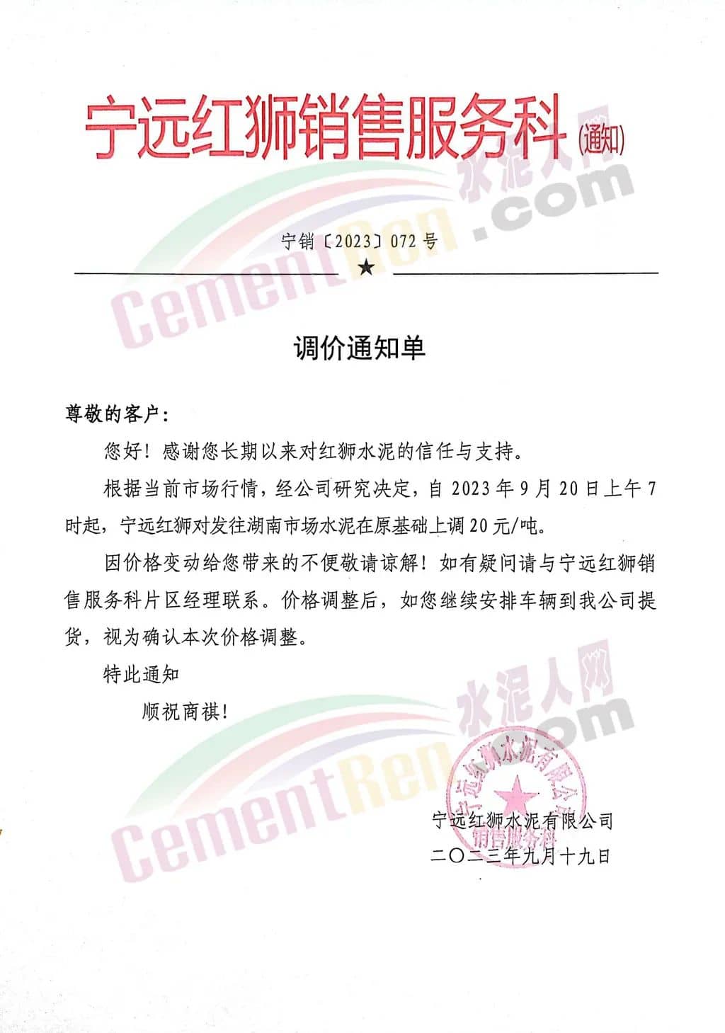 紅獅水泥旗下永州紅獅、寧遠(yuǎn)紅獅、衡陽(yáng)紅獅、永州蓮花水泥、康達(dá)(湖南)水泥等多家企業(yè)通知,根據(jù)當(dāng)前市場(chǎng)行情,經(jīng)公司研究決定,自2023年9月20日上午7時(shí)起各規(guī)格水泥價(jià)格在原基礎(chǔ)上上調(diào)20元/噸。