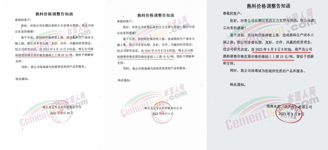 唐山冀東水泥股份有限公司營(yíng)銷分公司通知,由于企業(yè)環(huán)保投入、原燃材料價(jià)格持續(xù)上漲以及停限產(chǎn)等因素的共同影響,致使生產(chǎn)成本不斷提高。為保證企業(yè)正常運(yùn)營(yíng),自2023年9月20日16時(shí)起,熟料出廠價(jià)在原價(jià)格基礎(chǔ)上上調(diào)50元/噸。