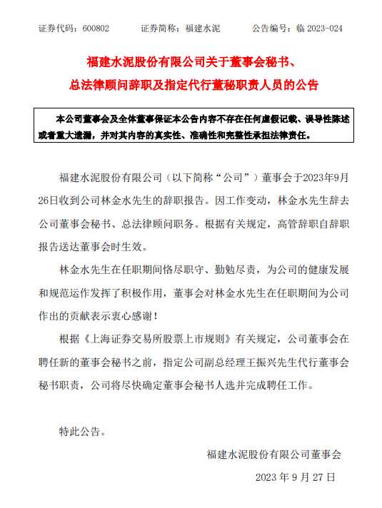 福建水泥發布公告稱,董事會于2023年9月26日收到公司林金水先生的辭職報告。因工作變動,林金水先生辭去公司董事會秘書、總法律顧問職務。根據有關規定,高管辭職自辭職報告送達董事會時生效。