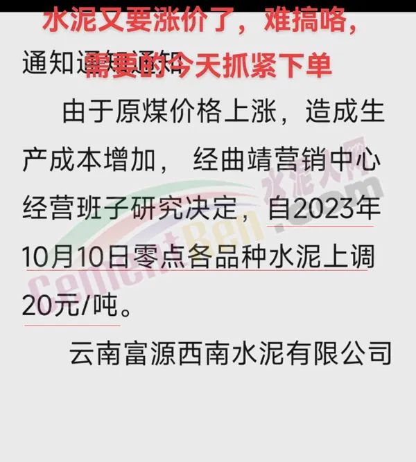 云南富源西南水泥有限公司通知,由于原煤價(jià)格上漲,造成生產(chǎn)成本增加,經(jīng)曲靖營銷中心經(jīng)營班子研究決定,自2023年10月10日零點(diǎn)各品種水泥上調(diào)20元/噸。