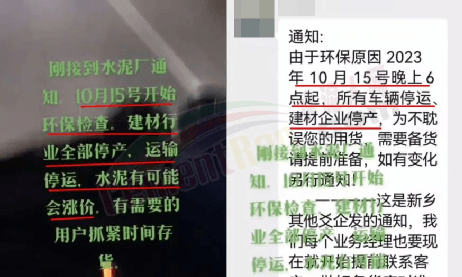河南水泥企業(yè)通知,由于環(huán)保原因2023年10月15日晚上6點起,所有車輛停運、建材企業(yè)停產(chǎn)。
