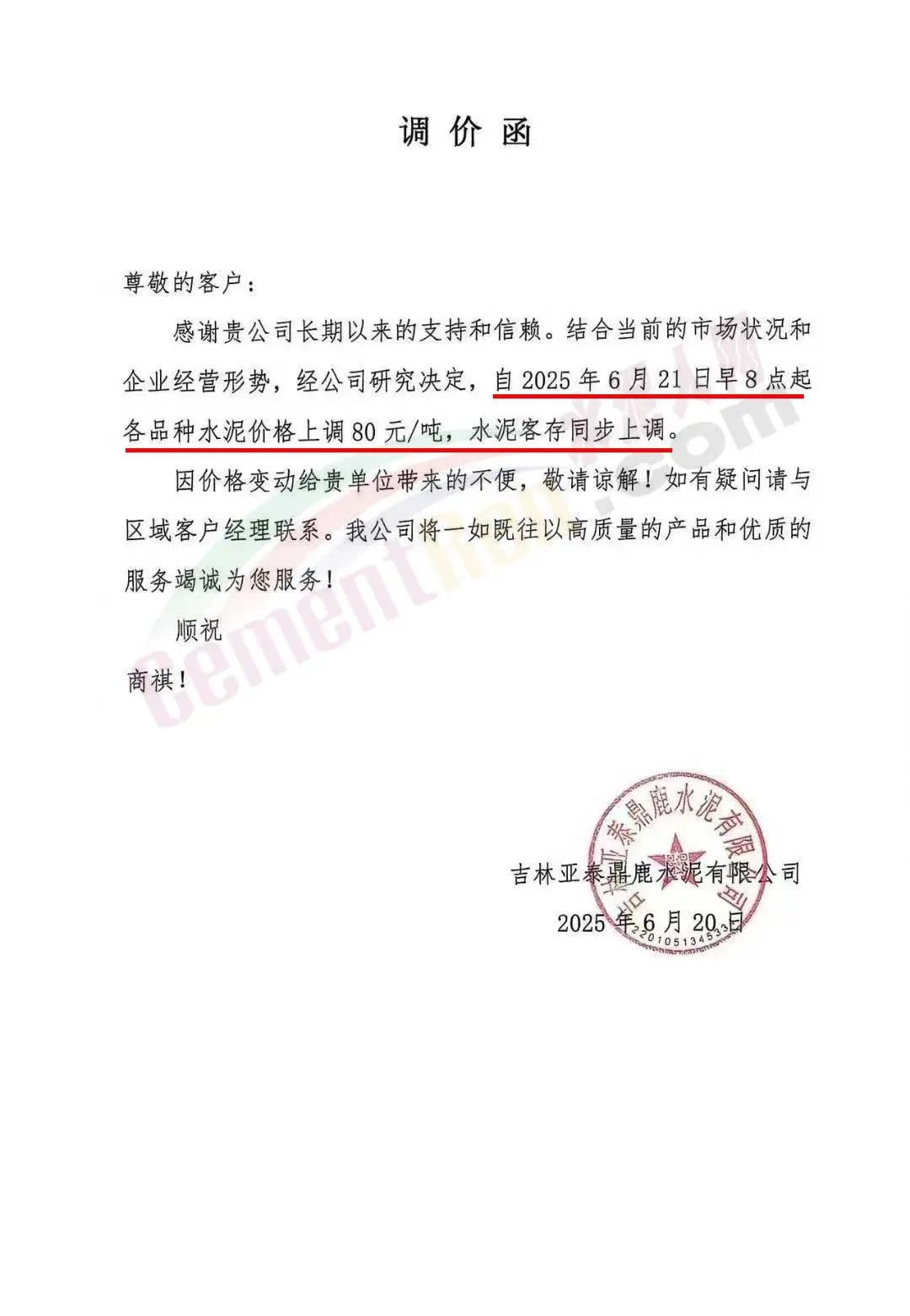 吉林亞泰鼎鹿水泥有限公司通知,結(jié)合當(dāng)前的市場狀況和企業(yè)經(jīng)營形勢,經(jīng)公司研究決定,自2025年6月21日早8點(diǎn)起各品種水泥價(jià)格上調(diào)80元/噸,水泥客存同步上調(diào)。