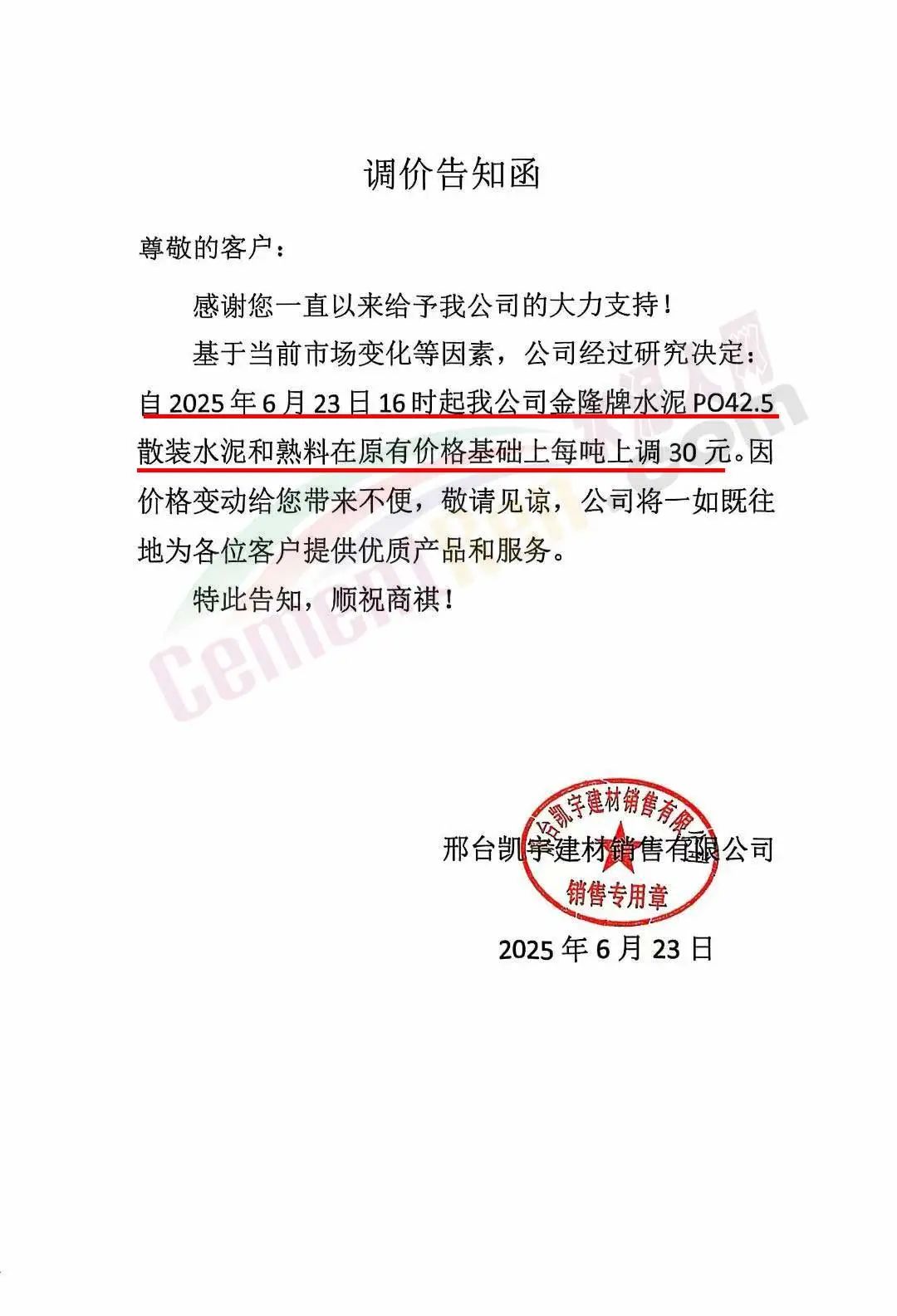 邢臺(tái)凱宇建材銷售有限公司通知,基于當(dāng)前市場變化等因素,公司經(jīng)過研究決定:自2025年6月23日16時(shí)起公司金隆牌水泥PO42.5散裝水泥和熟料在原有價(jià)格基礎(chǔ)上每噸上調(diào)30元。