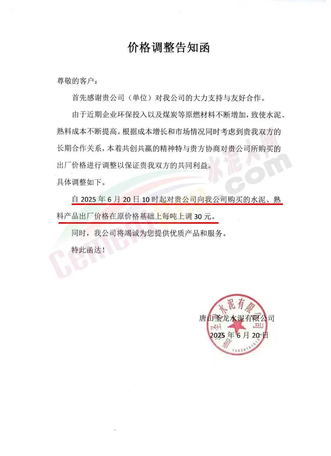 河北金隅冀東供應(yīng)鏈有限公司通知,近期原燃材料成本持續(xù)上漲、環(huán)保管控力度不斷加強(qiáng),致使我公司水泥(熟料)生產(chǎn)成本增加。為維持企業(yè)正常生產(chǎn)運(yùn)營和貴我雙方的長遠(yuǎn)合作,根據(jù)當(dāng)前市場情況,經(jīng)公司研究決定:自2025年6月24日0時(shí)起,公司銷售的所有水泥、熟料出廠價(jià)格在原價(jià)格基礎(chǔ)上上調(diào)30元/噸。