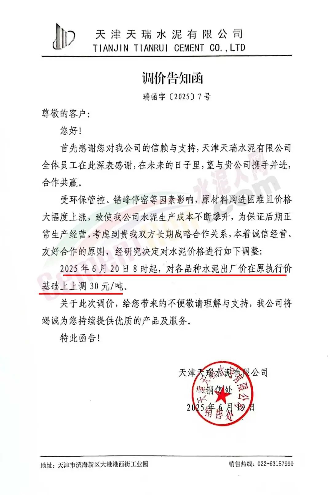 天津天瑞水泥有限公司通知,受環(huán)保管控、錯(cuò)峰停窯等因素影響,原材料購進(jìn)困難且價(jià)格大幅度上漲,致使公司水泥生產(chǎn)成本不斷攀升,為保證后期正常生產(chǎn)經(jīng)營,經(jīng)研究決定2025年6月20日8時(shí)起,對各品種水泥出廠價(jià)在原執(zhí)行價(jià)基礎(chǔ)上上調(diào)30元/噸。