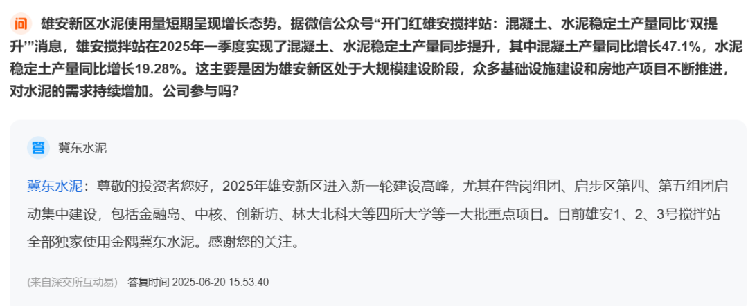 值得關(guān)注的是,近期冀東水泥在上市公司平臺(tái)回應(yīng)投資者時(shí)表示:”2025年雄安新區(qū)進(jìn)入新一輪建設(shè)高峰,尤其在昝崗組團(tuán)、啟步區(qū)第四、第五組團(tuán)啟動(dòng)集中建設(shè),包括金融島、中核、創(chuàng)新坊、林大北科大等四所大學(xué)等一大批重點(diǎn)項(xiàng)目。目前雄安1、2、3號(hào)攪拌站全部獨(dú)家使用金隅冀東水泥。“