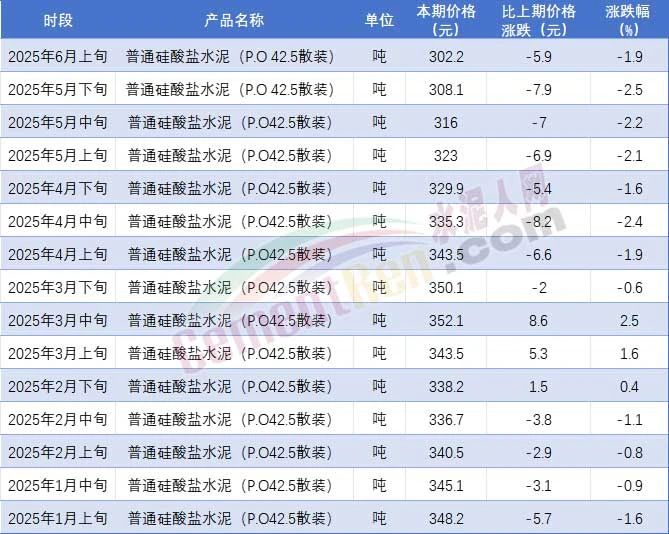 國家統(tǒng)計局?jǐn)?shù)據(jù)從另一側(cè)面印證崩盤趨勢,2025年6月上旬,P.O42.5散裝水泥全國均價跌至302.2元/噸,較年初暴跌46元,實現(xiàn)連續(xù)12期下跌,潰敗已成燎原之勢。