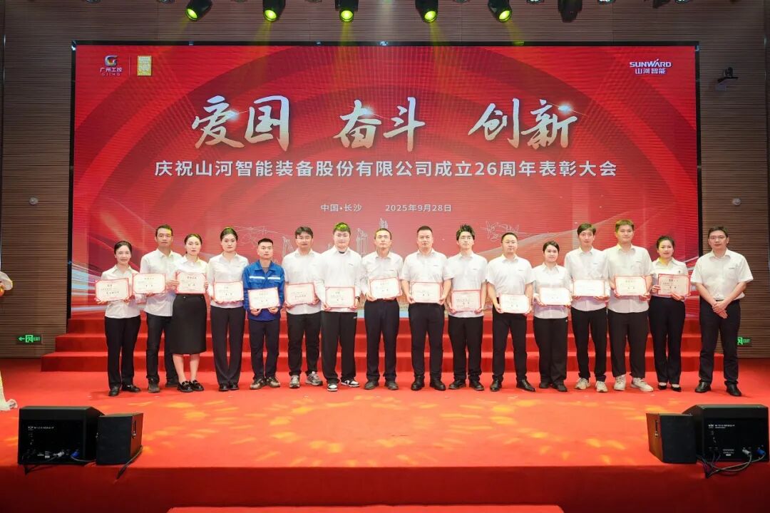大會在莊嚴的《國歌》聲中拉開帷幕。付向東為新晉十年老員工授勛。夏志宏等領導為在慶祝山河智能成立26周年系列活動中獲獎的單位和個人頒獎。